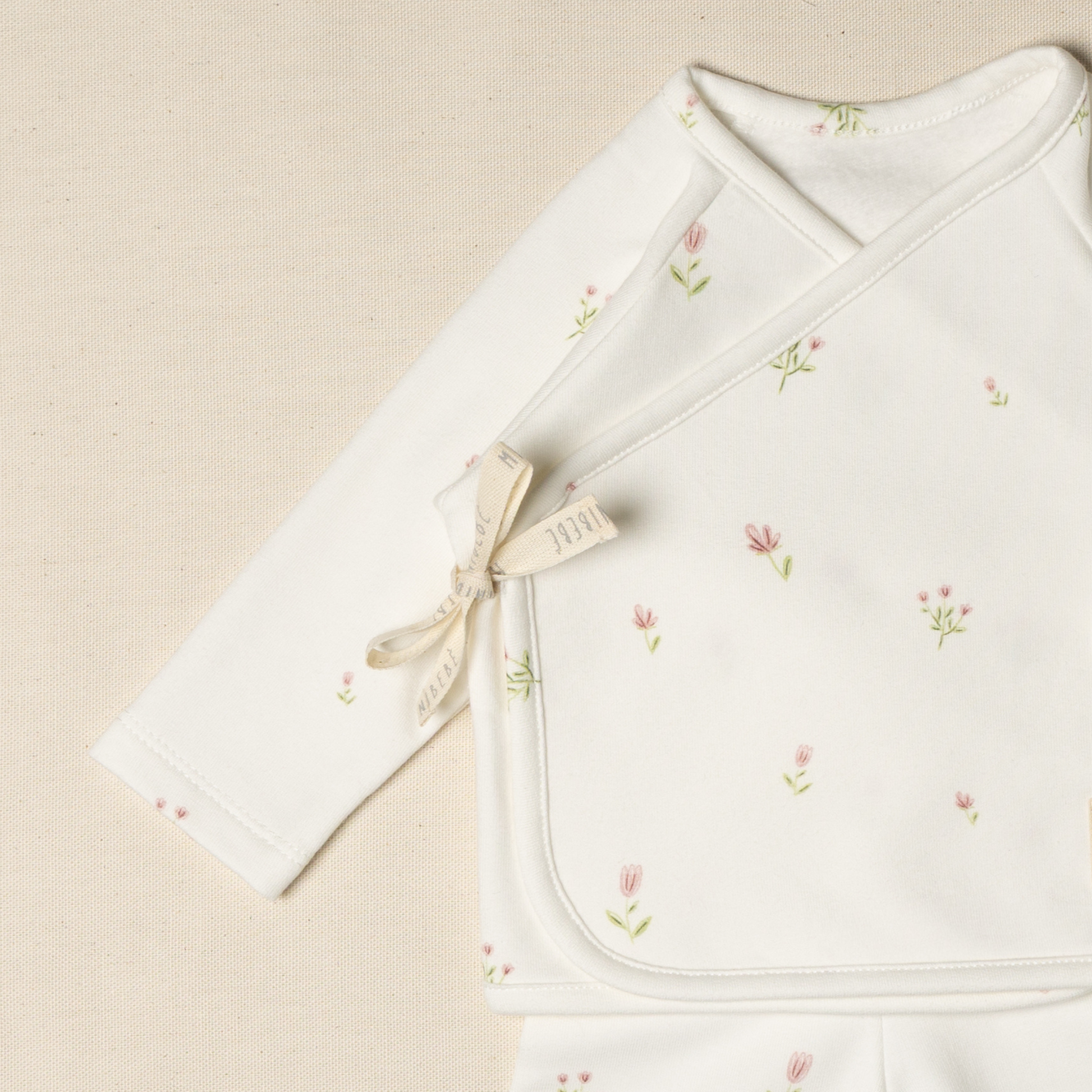 • Maglia kimono incrociata: permette di vestire il neonato senza far passare il capo dalla testa, proteggendo delicatamente il petto. La chiusura è semplice e sicura grazie a un bottone interno e due lacci regolabili, che assicurano una vestibilità perfetta.