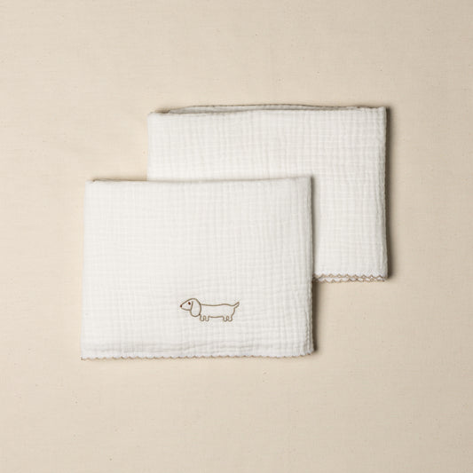 Completa il corredino coordinando il completino con gli altri accessori della linea Puppy: capellini, bavaglino, accappatoio, lenzuola e coperta, per un outfit armonioso e raffinato dalla culla alle prime uscite.